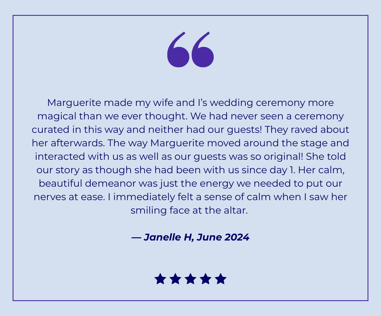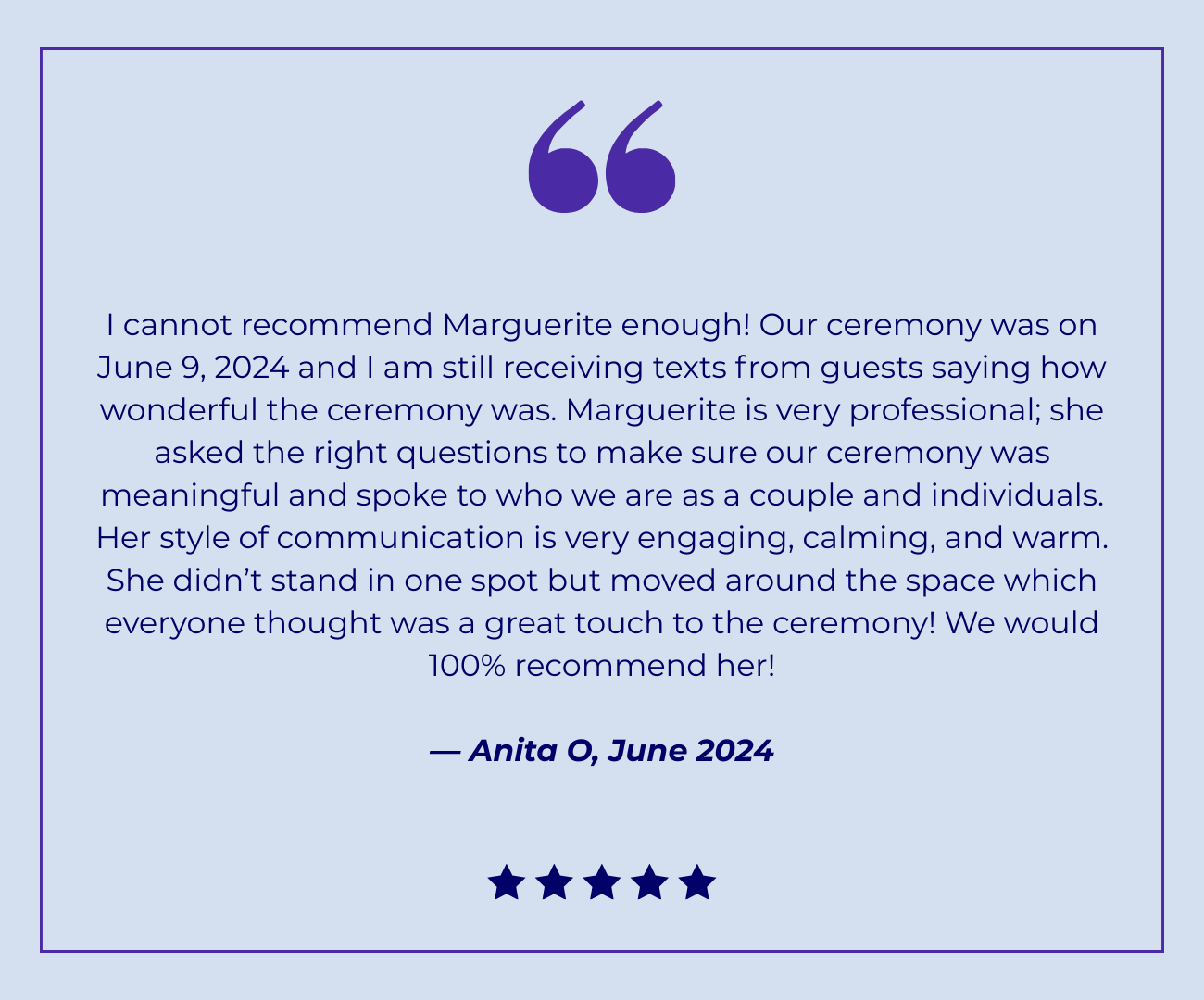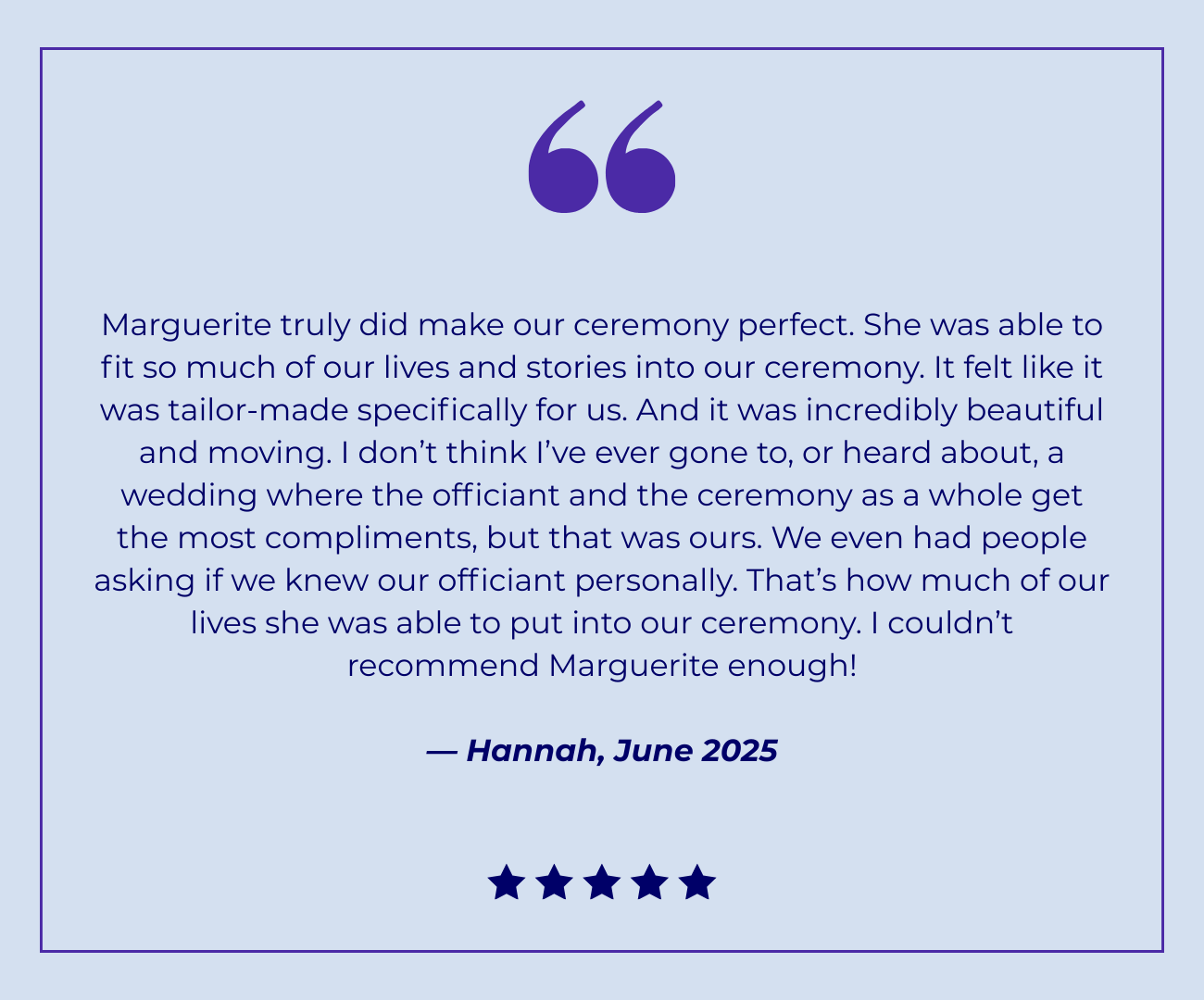 Marguerite is a highly-rated Chicago Wedding Officiant for in-person ceremonies, but she offers End-of-Life Doula services and custom ceremony drafting consultations nationally.