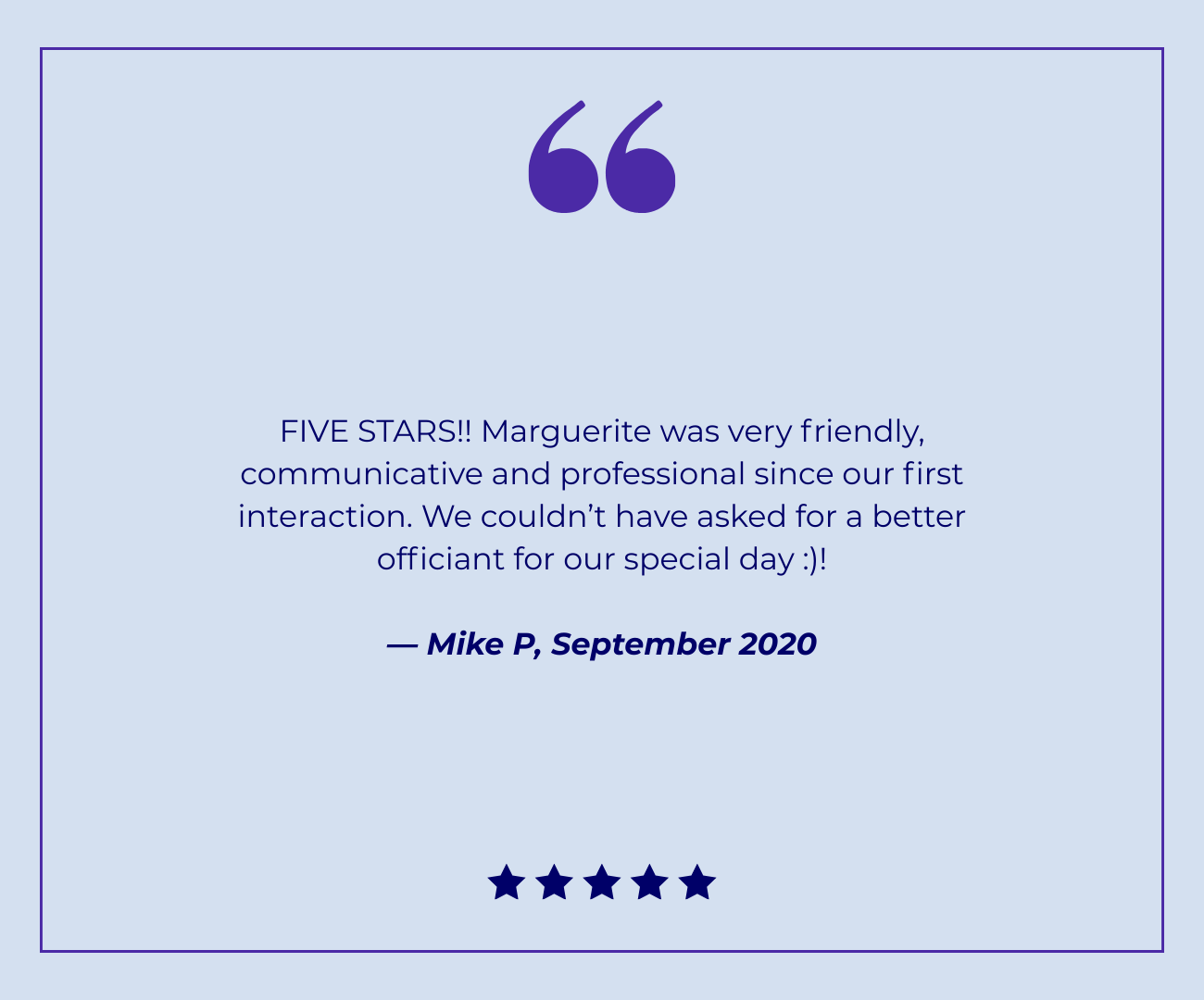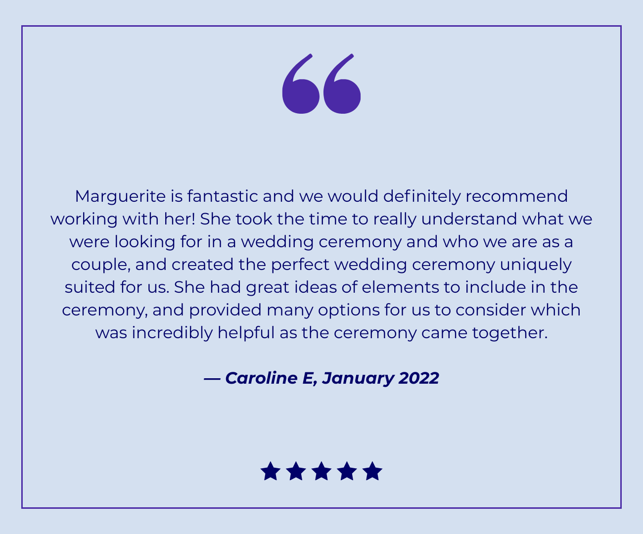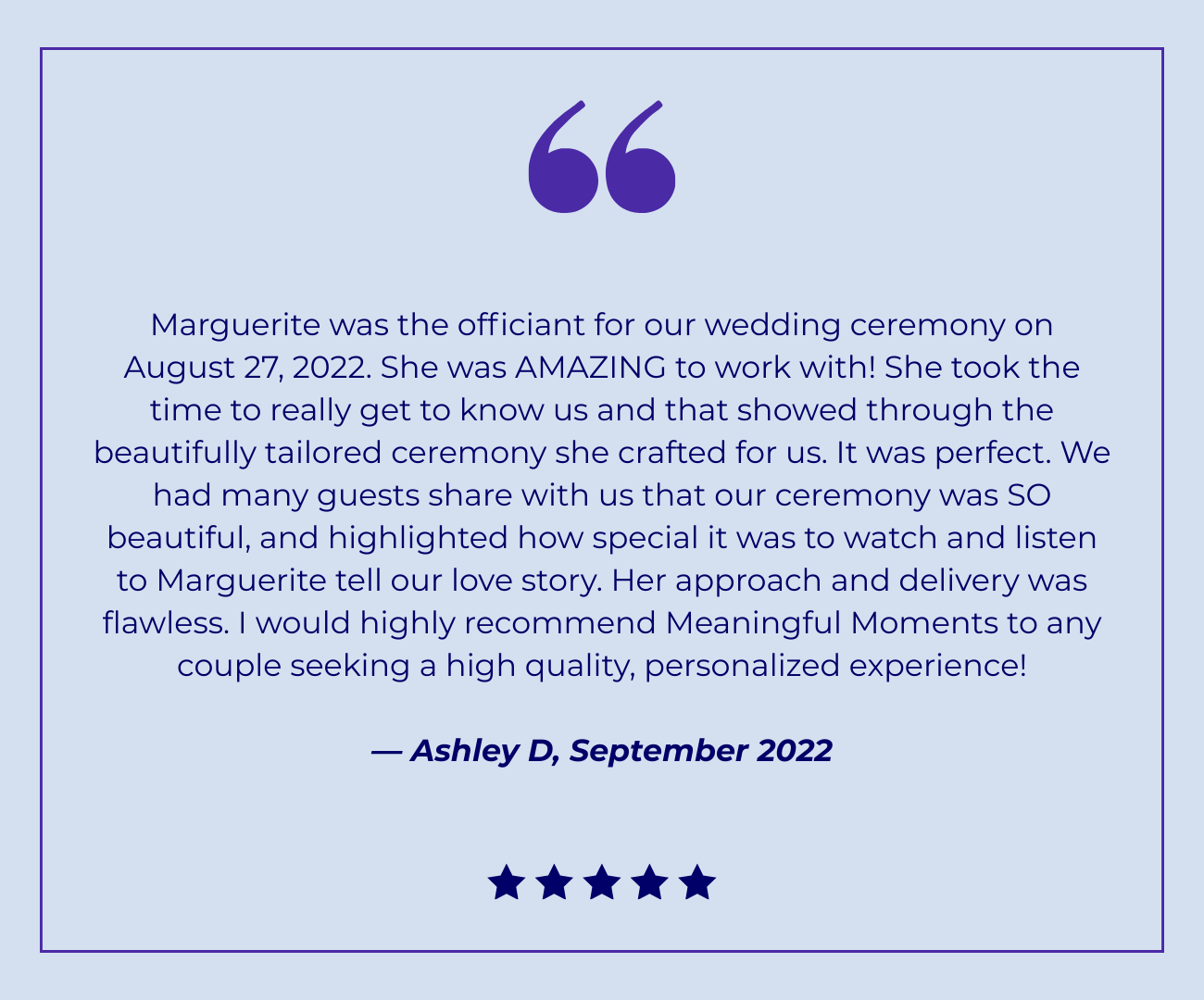 Marguerite is a highly-rated Chicago Wedding Officiant for in-person ceremonies, but she offers End-of-Life Doula services and custom ceremony drafting consultations nationally.